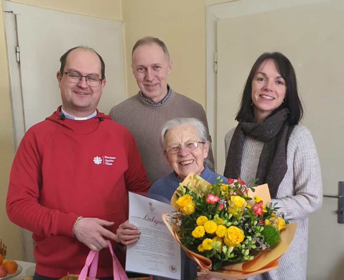 Pán riaditeľ Peter Birčák jej za celú Diecéznu charitu Žilina zablahoželal k jej krásnemu jubileu a poďakoval za dlhé roky obetavej a nezištnej služby: