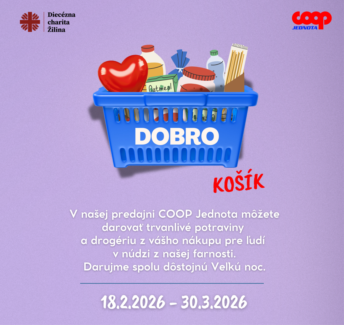 V období od 18.2. do 30.3. 2026 prebieha v niektorých predajniach COOP Jednota zbierka pre ľudí v núdzi. Aj vy môžete prispieť k tomu, aby rodinky či jednotlivci v núdzi mohli prežiť o niečo dôstojnejšie veľkonočné sviatky.
