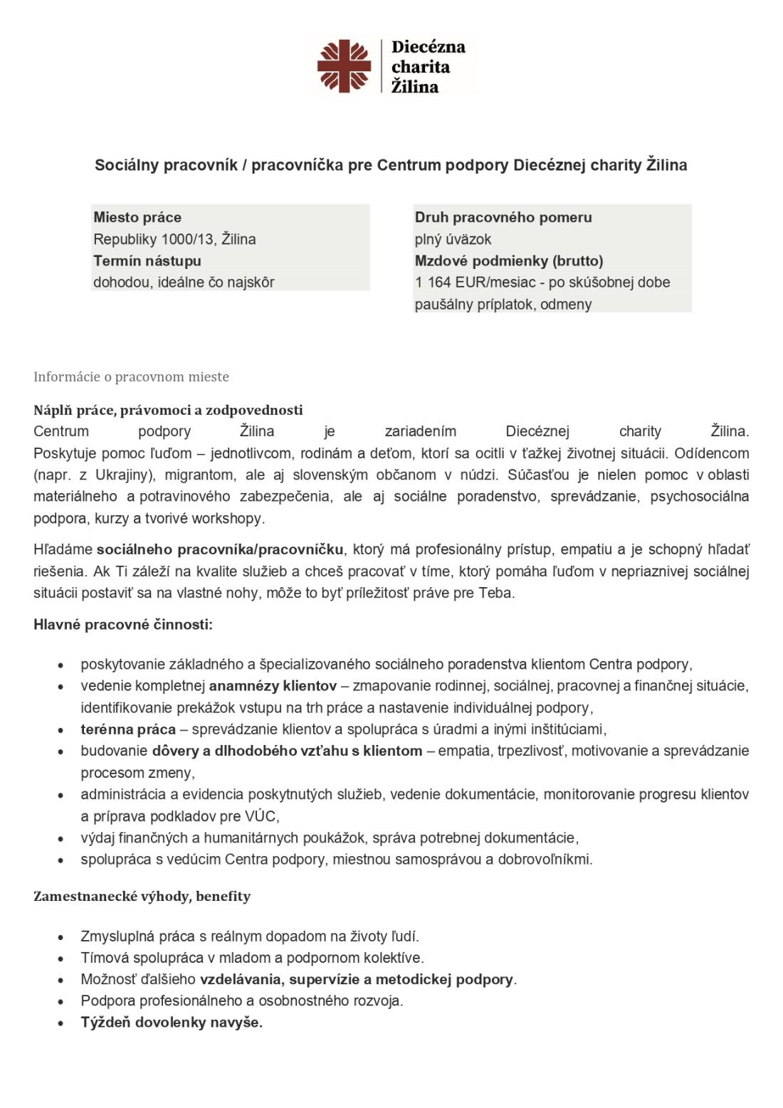 Priatelia, do nášho Centra podpory hľadáme sociálneho pracovníka. Pridaj sa k nám a reštartni svoj život vďaka novým výzvam.