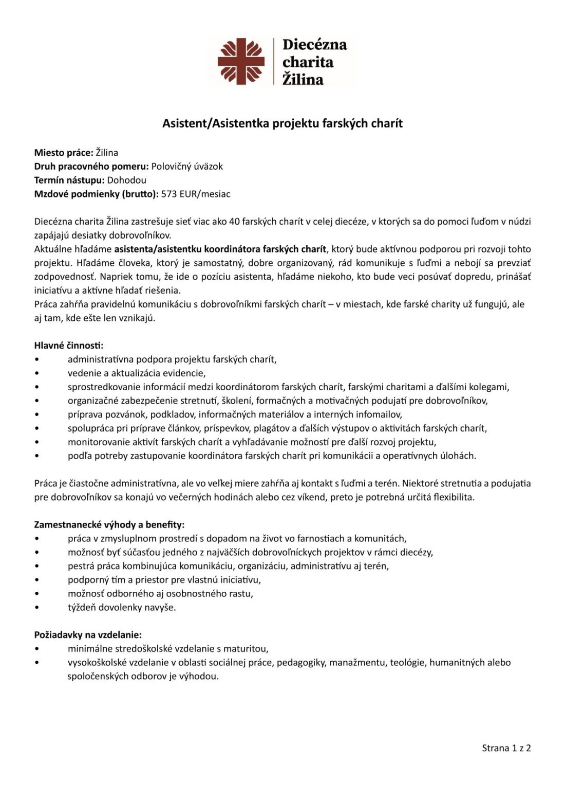 Hľadáme asistenta / asistentku projektu farských charít s organizačným talentom.